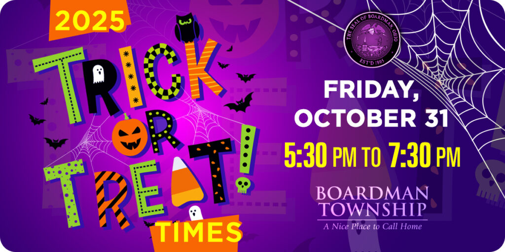 Halloween Trick-or-Treating will take place in Boardman on Friday, October 31 from 5:30 p.m. to 7:30 p.m.